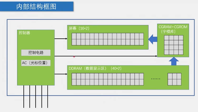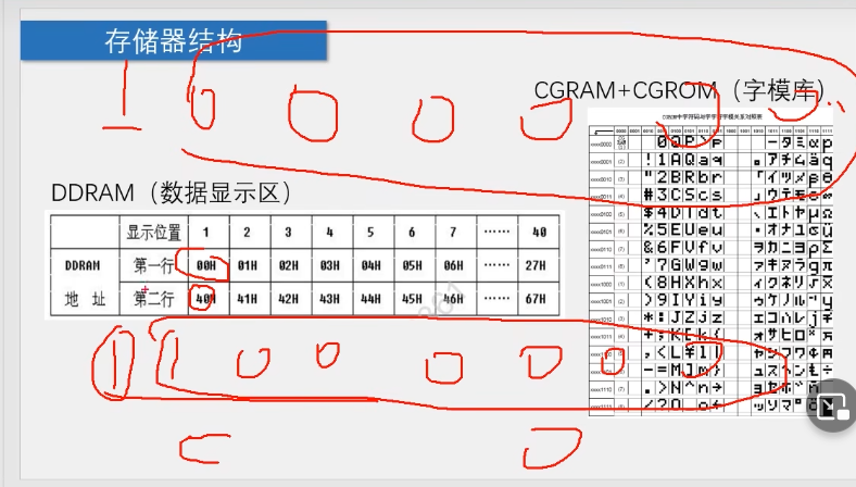 DDRAM,用户可写,对应到屏幕的话只会显示前16列(前16列映射到屏幕上),从第17列开始可以写,因为屏幕不够大所以显示不了(问题不大)