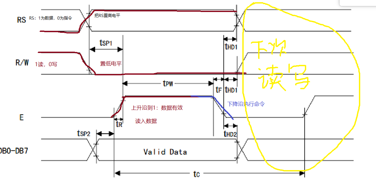 E:上升沿的时候把数据传到D1~D7,下降沿的时候执行命令