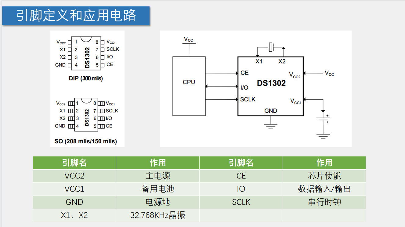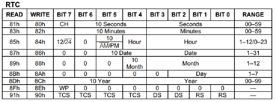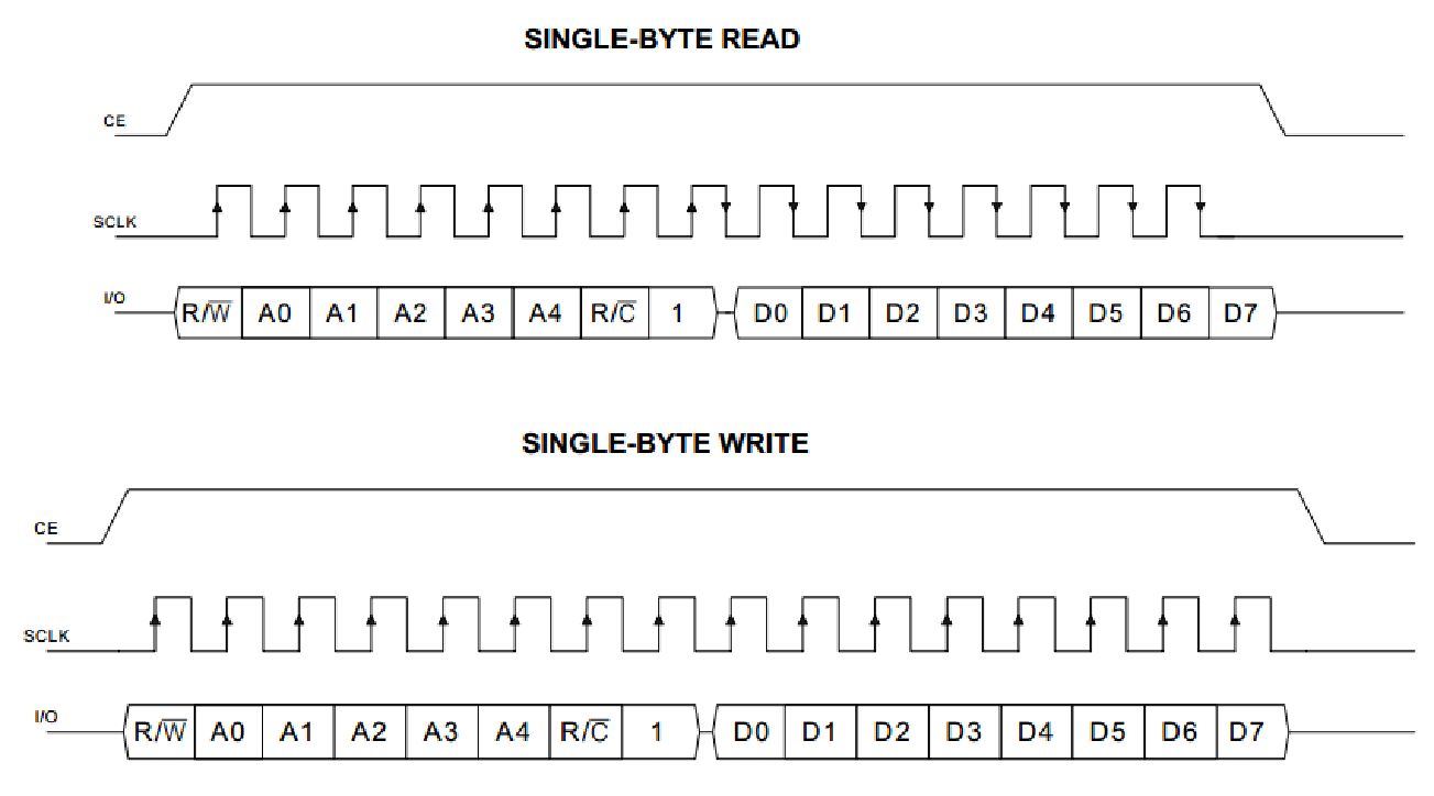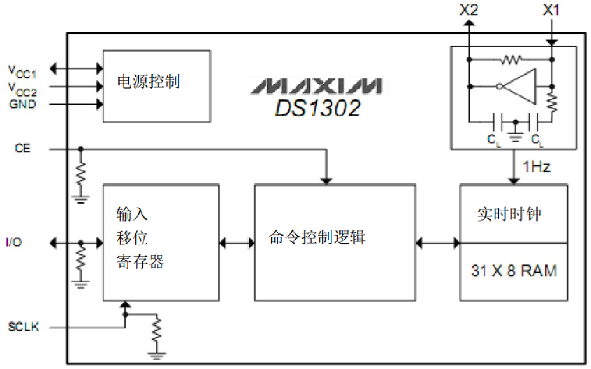 其中,CE为高电平的时候下面的命令(io和SCLK)才有用。时间存储在实时时钟里,在左边被访问和读写