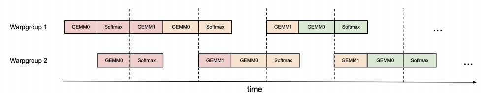 - 然后warpgroup 1执行GEMMs(GEMM1和GEMM0),warpgroup 2执行softmax